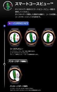 今までの腕時計型GPS距離測定器ではグリーンまでの距離、ハザードなどの距離、レイアップ地点の距離、新しいものだとコースレイアウトまで映るものもありました。
